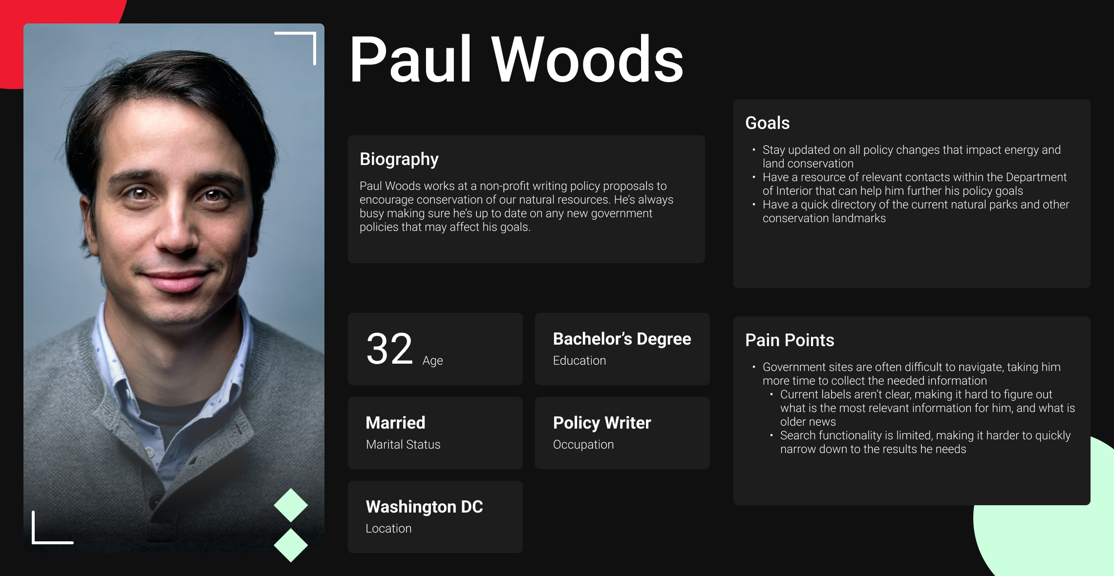 I created Paul as a starting point for imagining the journey a user would take through the DoI’s current site. As I followed his journey, I took notes of the strengths and weaknesses of each page’s design and what elements could prevent Paul from accomplishing his goals.