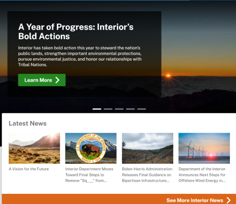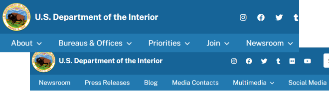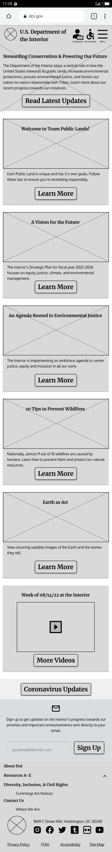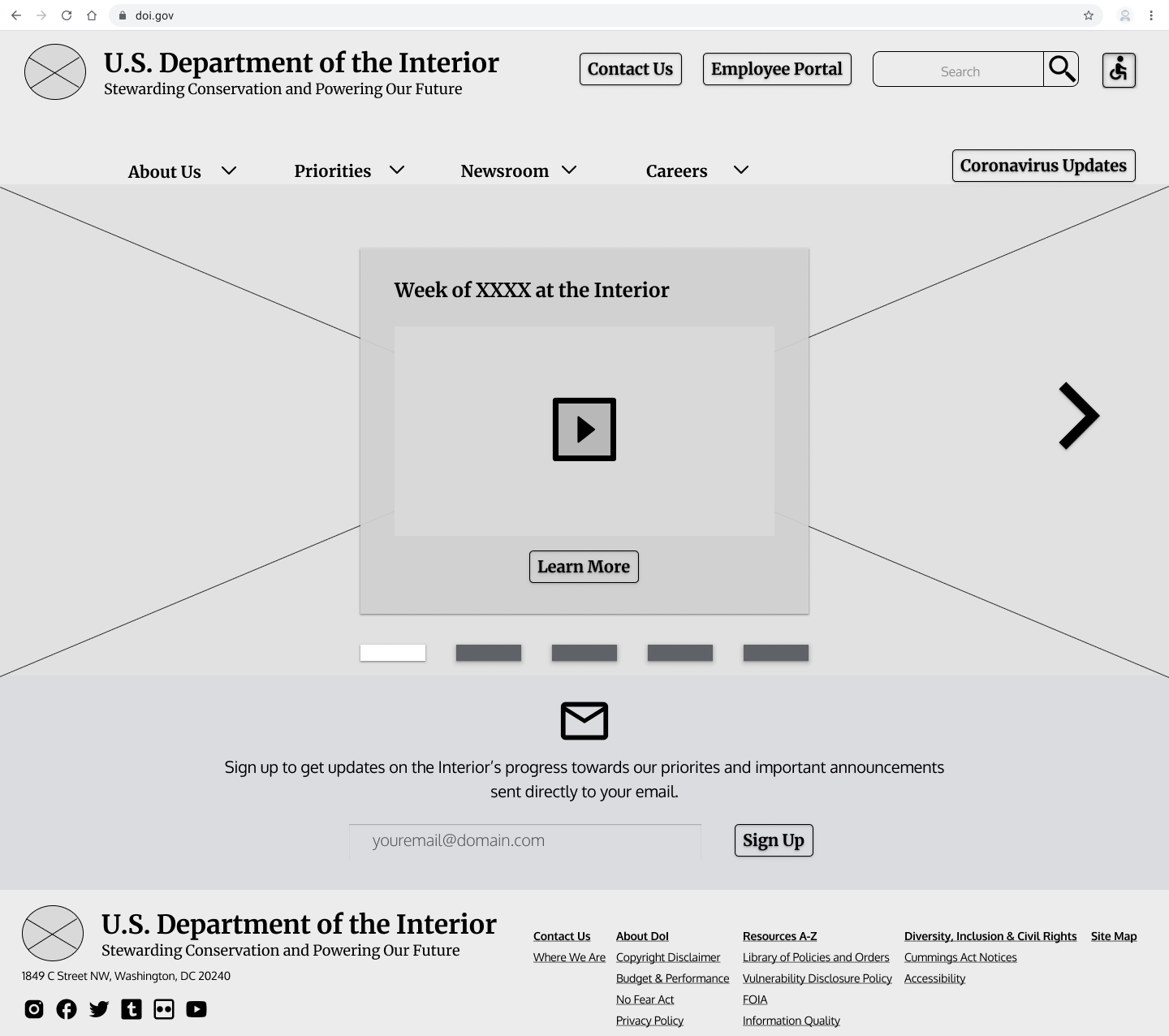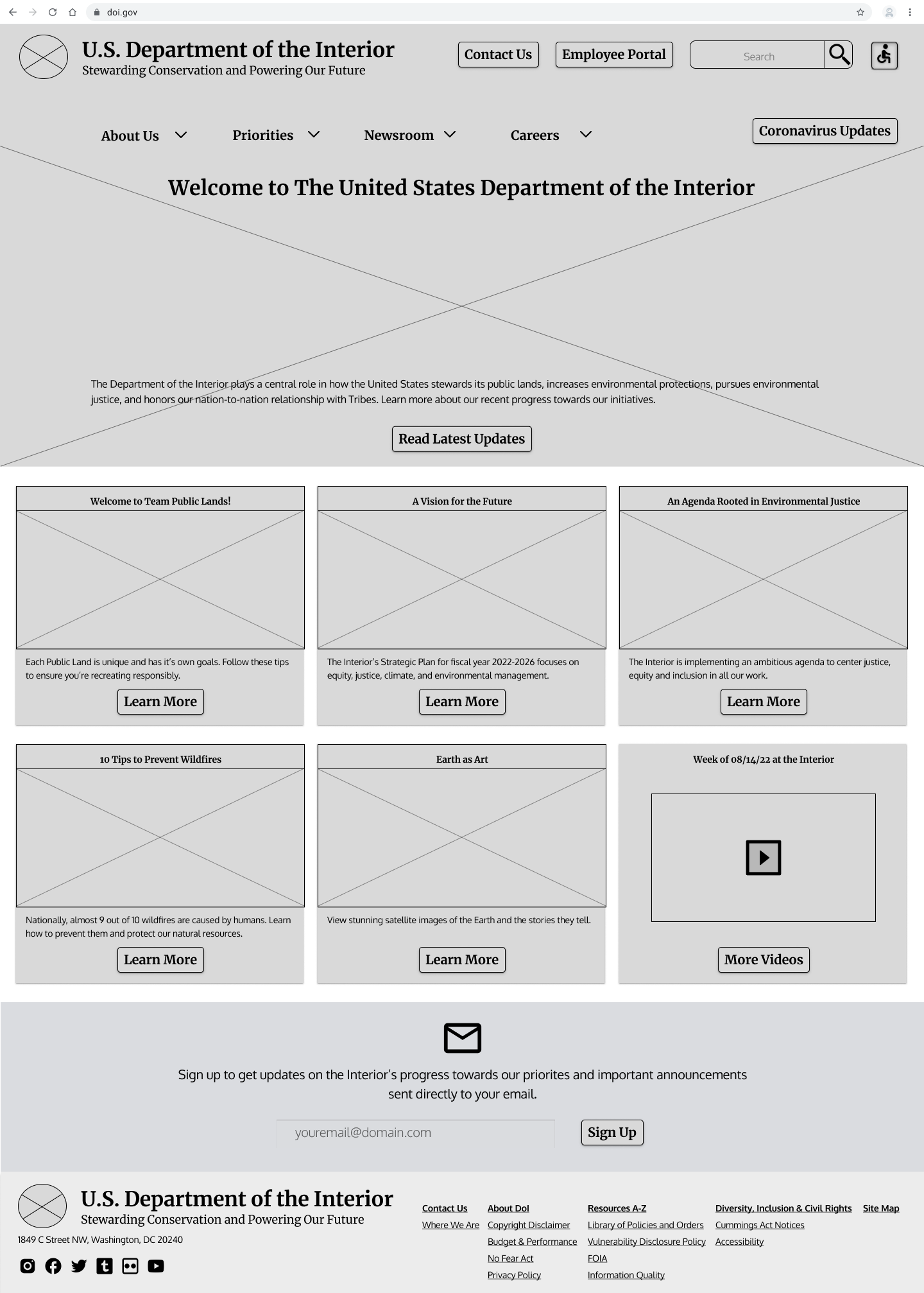 The second iteration of the homepage removed the carousel in the hero and instead provided the DoI’s mission. The news updates were moved below the hero and broken out into a grid so that all the information could be seen immediately.