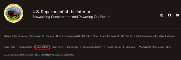A government agency must be easily accessible to its constituents, but the DoI’s contact form is only see in the footer on the homepage.