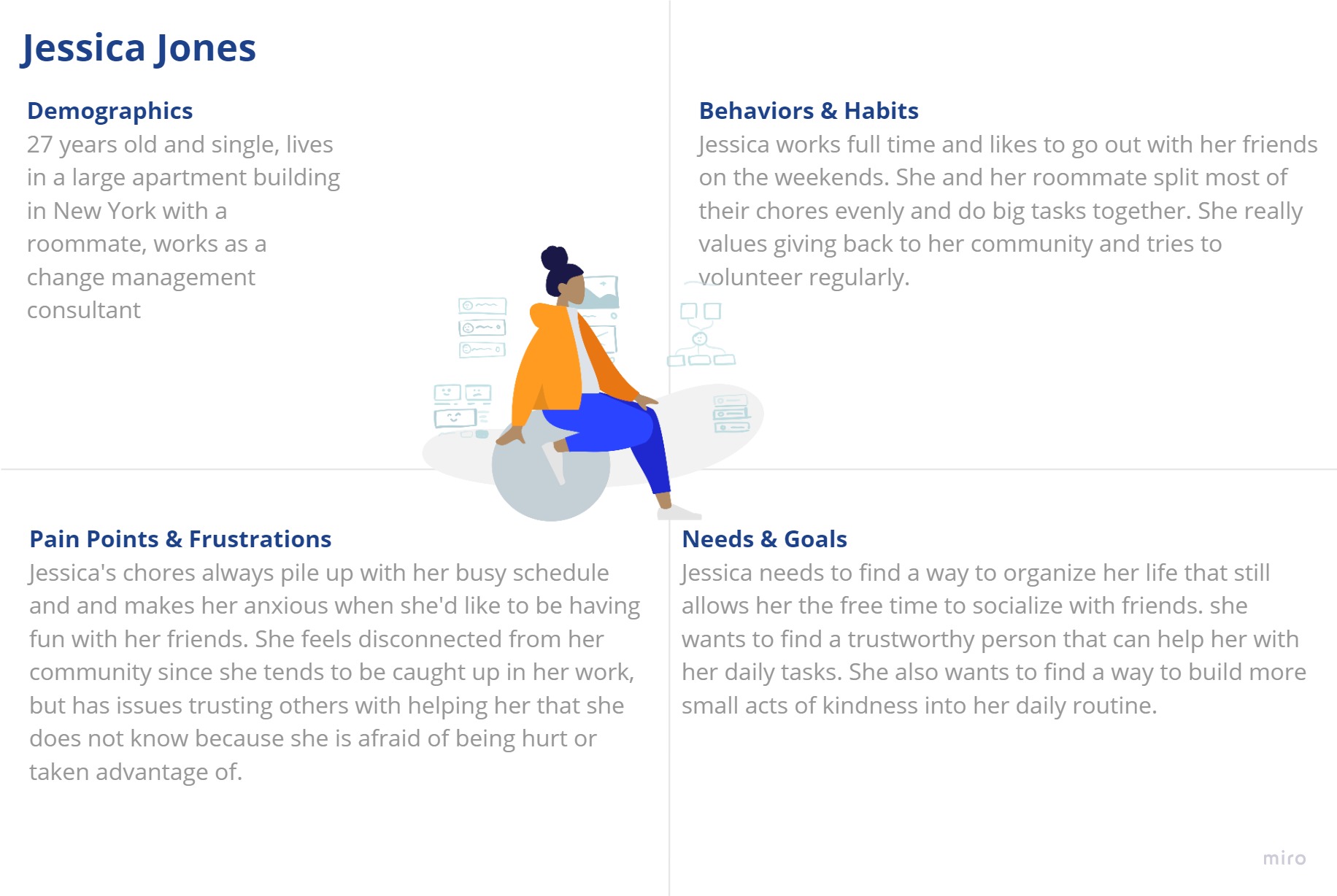 We created Jessica to embody our users - people with a desire to engage with their community but that may also require some assistance with their daily lives as well.