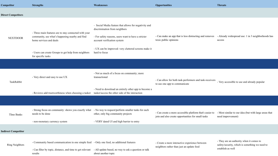 Our competitor analysis revealed that there are many task sharing apps available, although not all of them are community specific. These existing solutions do not fully address the need to manage smaller daily tasks however, since most of them are geared towards one-off projects or long-term community projects. The users we tested also did not adopt these apps due to concerns around trustworthiness and cost.