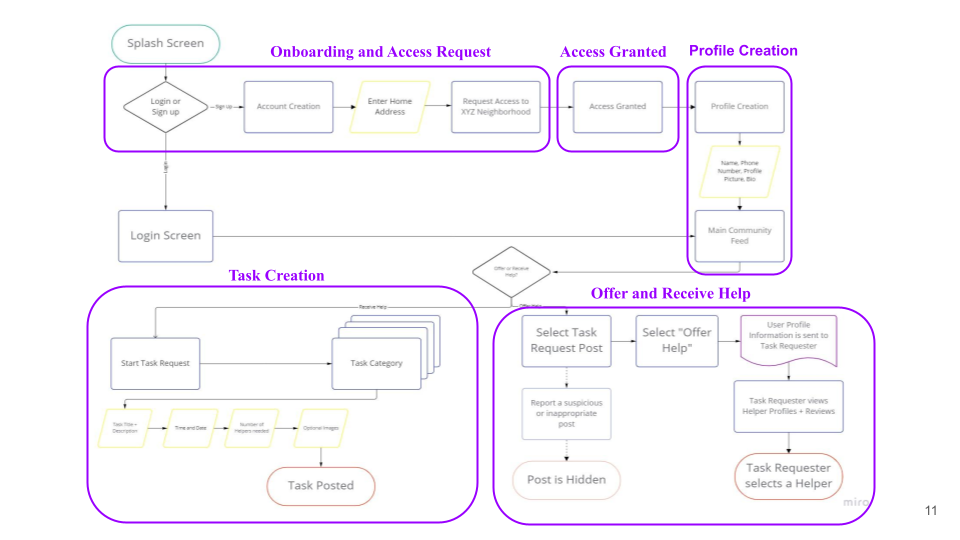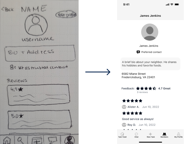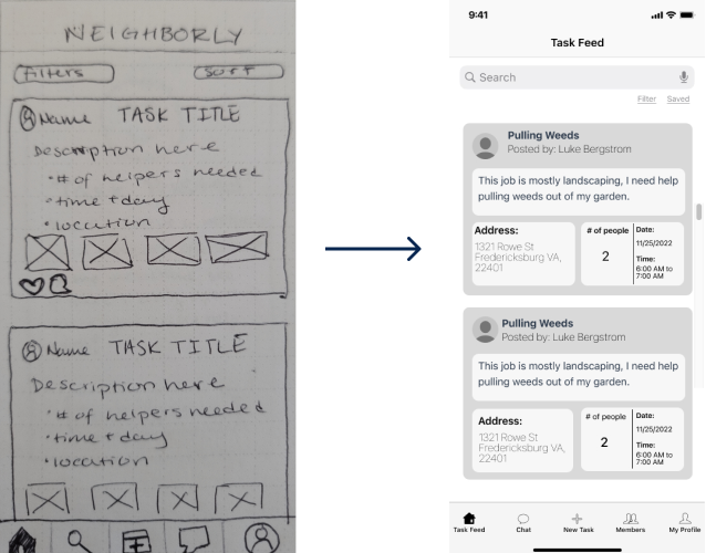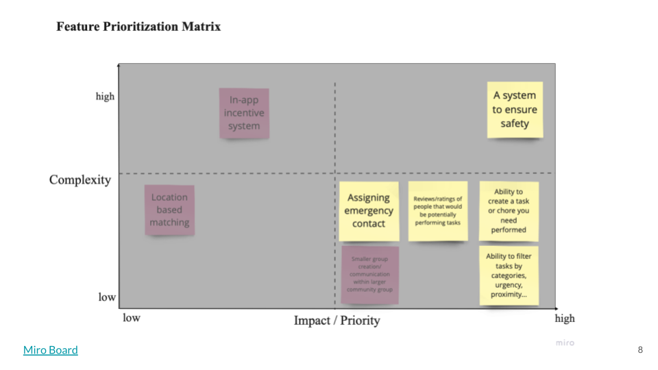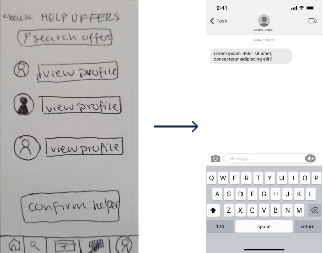 While our intial ideas for this app spanned a wide range of features, we need to scale down to a scope that was feasible for our 3 week timeline. We focused on features that would drive a sense of trust among users since our research showed this was the biggest hurdle to asking for help.